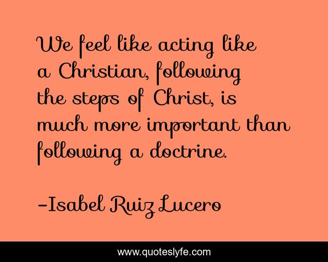 This page presents the quote "We feel like acting like a Christian, following the steps of Christ, is much more important than following a doctrine.". Author of this quote is Isabel Ruiz Lucero. This quote is about religion, christianity, christian, christian-living, spirituality,.