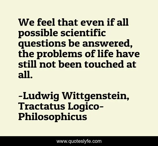 This page presents the quote "We feel that even if all possible scientific questions be answered, the problems of life have still not been touched at all.". Author of this quote is Ludwig Wittgenstein, Tractatus Logico-Philosophicus. This quote is about science, life, philosophy,.