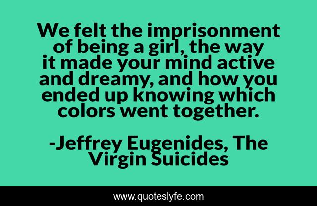 This page presents the quote "We felt the imprisonment of being a girl, the way it made your mind active and dreamy, and how you ended up knowing which colors went together.". Author of this quote is Jeffrey Eugenides, The Virgin Suicides. .