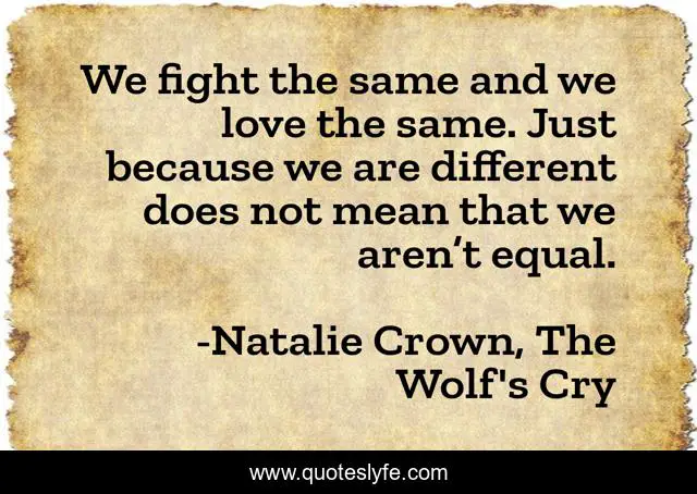 This page presents the quote "We fight the same and we love the same. Just because we are different does not mean that we aren’t equal.". Author of this quote is Natalie Crown, The Wolf's Cry. This quote is about twc, the-semei-trilogy, ya, shapeshifters, adventure, fantasy-fiction, natalie-crown, the-wolf-s-cry, young-adult,.