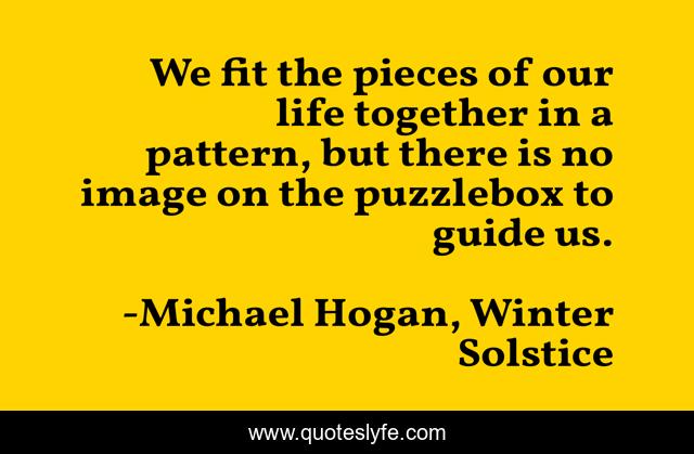 This page presents the quote "We fit the pieces of our life together in a pattern, but there is no image on the puzzlebox to guide us.". Author of this quote is Michael Hogan, Winter Solstice. This quote is about beautiful, epiphany, touching, truth, realization, life-philosophy,.