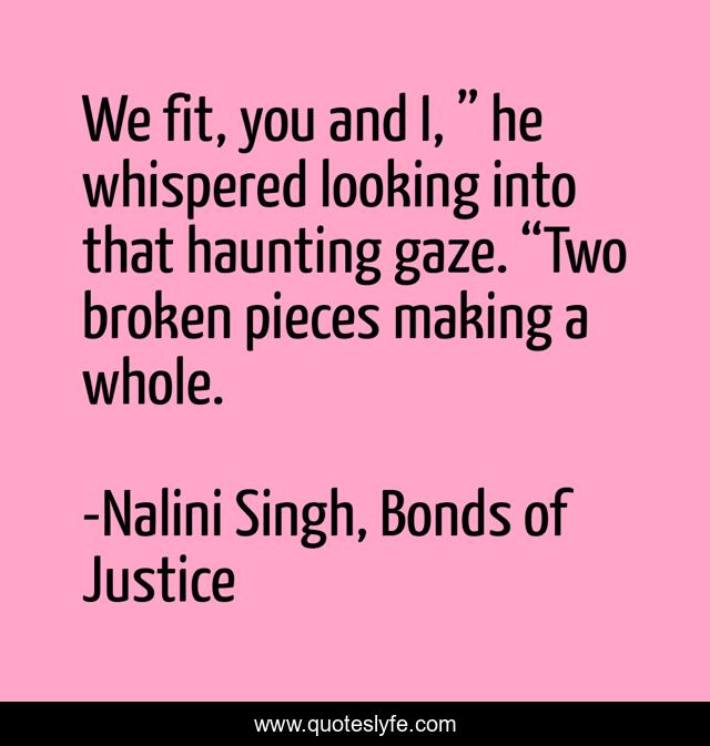 This page presents the quote "We fit, you and I, ” he whispered looking into that haunting gaze. “Two broken pieces making a whole.". Author of this quote is Nalini Singh, Bonds of Justice. This quote is about couples, broken, max,.