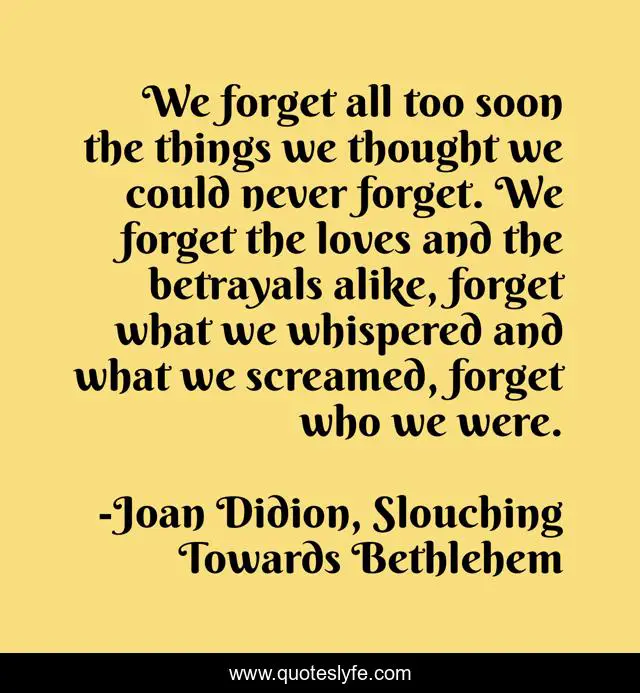 "Joan Didion, Slouching Towards Bethlehem Quotes." Quoteslyfe.com, 2025. Sat. 06 Dec. 2025. <https://www.quoteslyfe.com/quote/We-forget-all-too-soon-the-things-141497>.