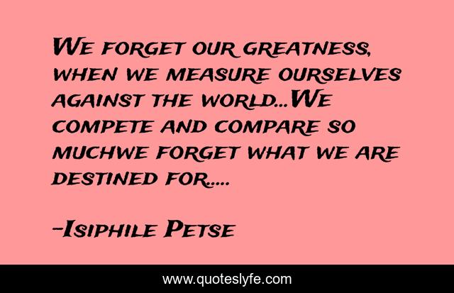 This page presents the quote "We forget our greatness, when we measure ourselves against the world...We compete and compare so muchwe forget what we are destined for.....". Author of this quote is Isiphile Petse. .