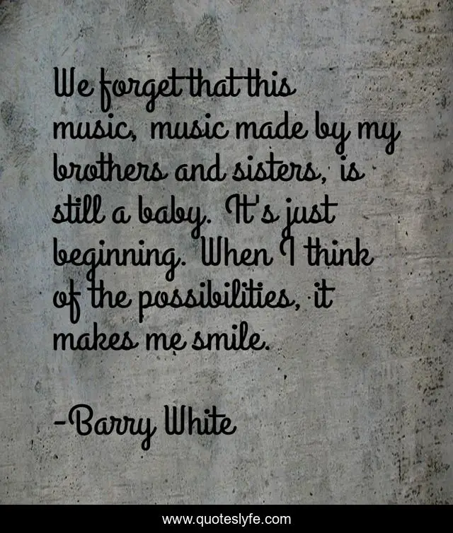 This page presents the quote "We forget that this music, music made by my brothers and sisters, is still a baby. It's just beginning. When I think of the possibilities, it makes me smile.". Author of this quote is Barry White. This quote is about baby, me, music,.