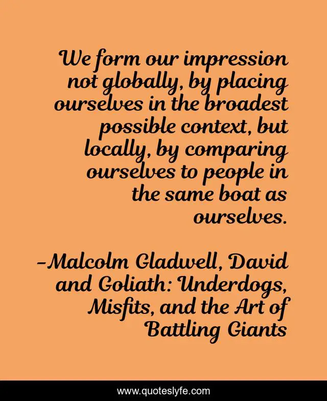 This page presents the quote "We form our impression not globally, by placing ourselves in the broadest possible context, but locally, by comparing ourselves to people in the same boat as ourselves.". Author of this quote is Malcolm Gladwell, David and Goliath: Underdogs, Misfits, and the Art of Battling Giants. This quote is about comparisons, pessimism, expectations, optimism,.