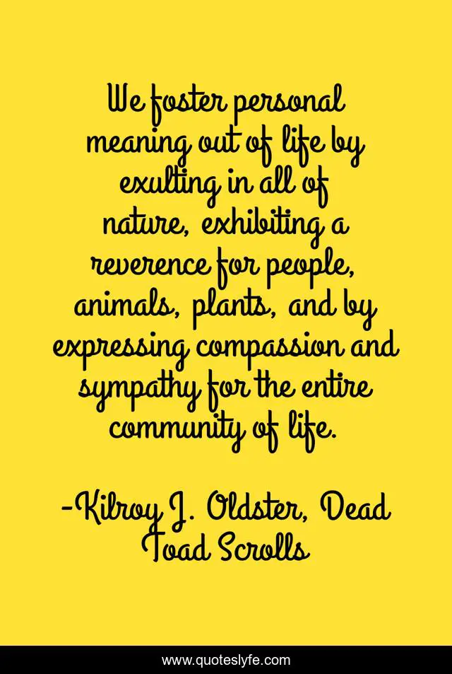 This page presents the quote "We foster personal meaning out of life by exulting in all of nature, exhibiting a reverence for people, animals, plants, and by expressing compassion and sympathy for the entire community of life.". Author of this quote is Kilroy J. Oldster, Dead Toad Scrolls. This quote is about meaningful-living, meaningful-life, compassion, compassionate, love-of-humanity, love-of-nature, sympathy, enlightenment-principles, reverence-for-life,.