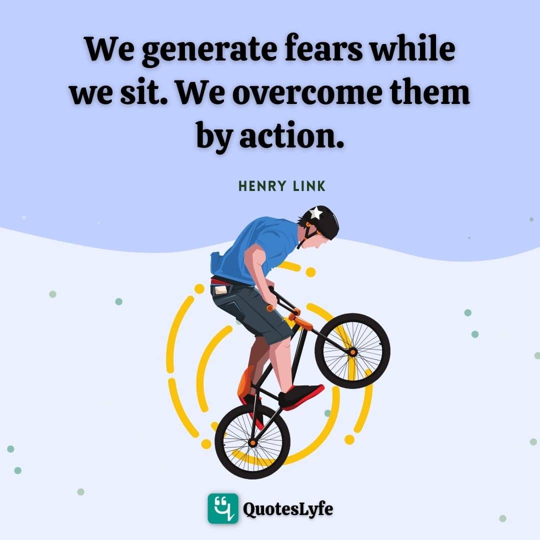 This page presents the quote "We generate fears while we sit. We overcome them by action.". Author of this quote is Henry Link. This quote is about fear, sitting, action,.