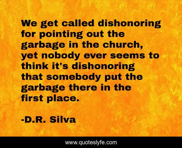This page presents the quote "We get called dishonoring for pointing out the garbage in the church, yet nobody ever seems to think it's dishonoring that somebody put the garbage there in the first place.". Author of this quote is D.R. Silva. This quote is about religion, reformation, revolution, christianity, church,.