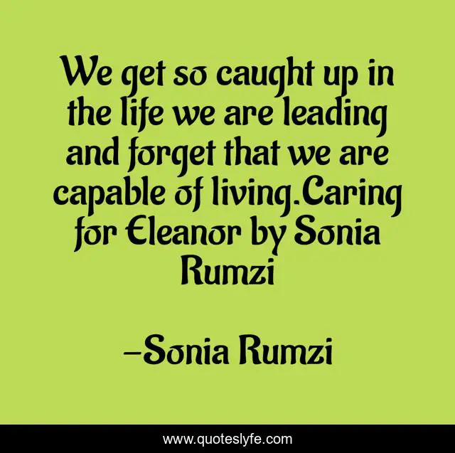 This page presents the quote "We get so caught up in the life we are leading and forget that we are capable of living.Caring for Eleanor by Sonia Rumzi". Author of this quote is Sonia Rumzi. This quote is about living, life, life-lessons, rumzi, caring-for-eleanor,.