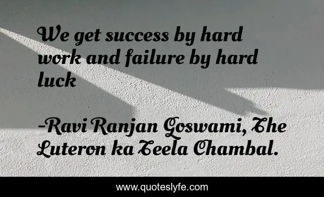 This page presents the quote "We get success by hard work and failure by hard luck". Author of this quote is Ravi Ranjan Goswami, The Luteron ka Teela Chambal.. This quote is about failure, hard-luck, success, luck,.