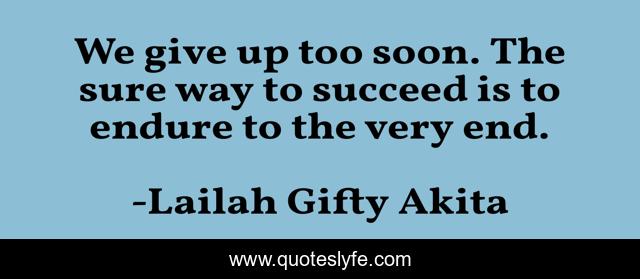 This page presents the quote "We give up too soon. The sure way to succeed is to endure to the very end.". Author of this quote is Lailah Gifty Akita. This quote is about success, dont-give-up, endure, inspirational, overcomer, enthusiasm,.