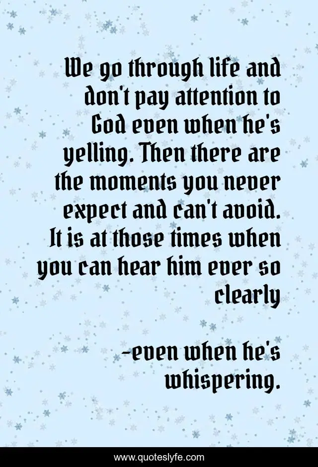 This page presents the quote "We go through life and don't pay attention to God even when he's yelling. Then there are the moments you never expect and can't avoid. It is at those times when you can hear him ever so clearly". Author of this quote is even when he's whispering.. .