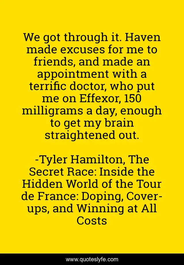 This page presents the quote "We got through it. Haven made excuses for me to friends, and made an appointment with a terrific doctor, who put me on Effexor, 150 milligrams a day, enough to get my brain straightened out.". Author of this quote is Tyler Hamilton, The Secret Race: Inside the Hidden World of the Tour de France: Doping, Cover-ups, and Winning at All Costs. This quote is about medication, psychiatric, depression, mental-disorder, depression-recovery, mental-illness,.