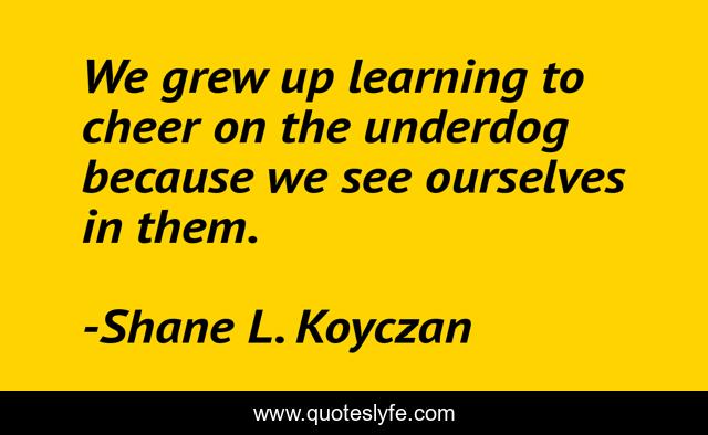 This page presents the quote "We grew up learning to cheer on the underdog because we see ourselves in them.". Author of this quote is Shane L. Koyczan. This quote is about to-this-day, underdog, childhood, fiction,.