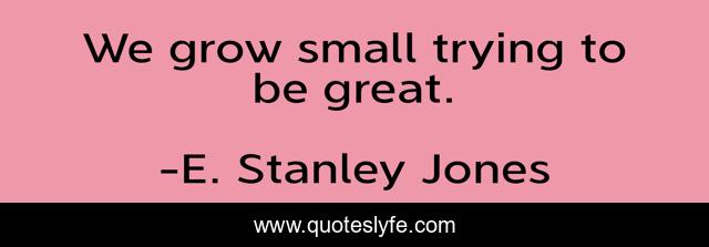 This page presents the quote "We grow small trying to be great.". Author of this quote is E. Stanley Jones. This quote is about small, trying, grow,.
