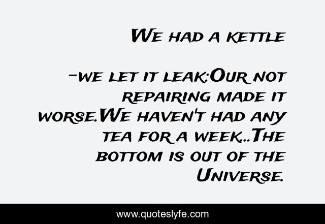 "we let it leak:Our not repairing made it worse.We haven't had any tea for a week...The bottom is out of the Universe. Quotes." Quoteslyfe.com, 2025. Sat. 06 Dec. 2025. <https://www.quoteslyfe.com/quote/We-had-a-kettle-89120>.