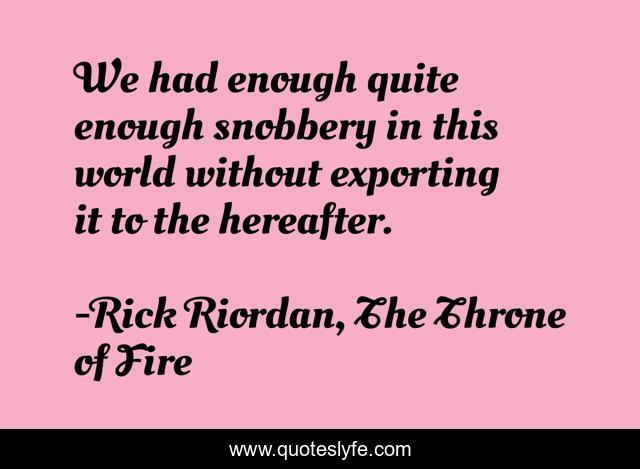 This page presents the quote "We had enough quite enough snobbery in this world without exporting it to the hereafter.". Author of this quote is Rick Riordan, The Throne of Fire. This quote is about afterlife, snobbery,.