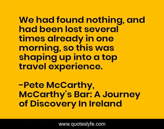 This page presents the quote "We had found nothing, and had been lost several times already in one morning, so this was shaping up into a top travel experience.". Author of this quote is Pete McCarthy, McCarthy's Bar: A Journey of Discovery In Ireland. This quote is about travel, travel-writing, ireland,.