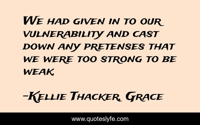 This page presents the quote "We had given in to our vulnerability and cast down any pretenses that we were too strong to be weak.". Author of this quote is Kellie Thacker, Grace. This quote is about faith, redemption, young-adult-romance, vampire, christian-fiction, new-adult, vampire-romance, kellie-thacker, young-adult,.
