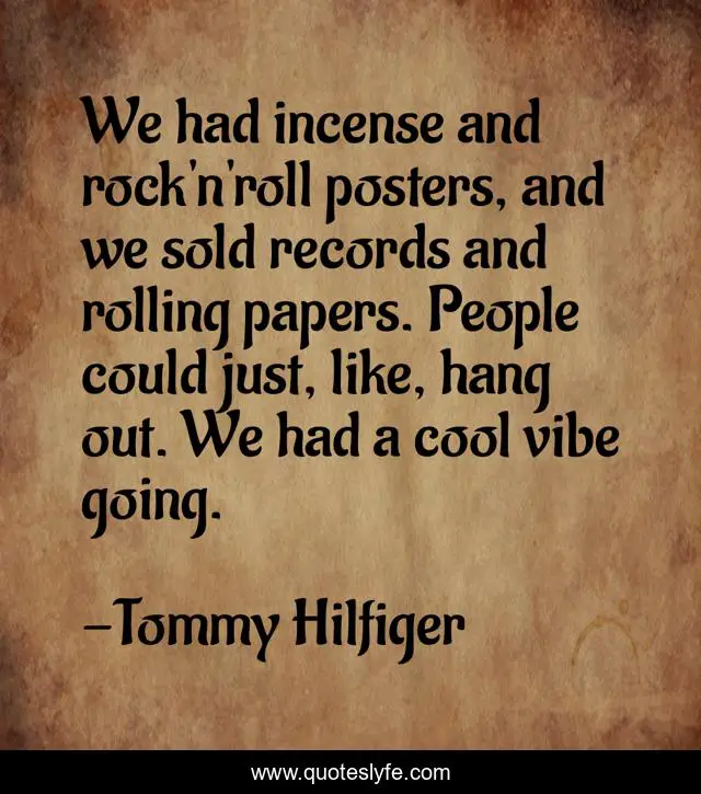 This page presents the quote "We had incense and rock'n'roll posters, and we sold records and rolling papers. People could just, like, hang out. We had a cool vibe going.". Author of this quote is Tommy Hilfiger. This quote is about rolling, records, people,.