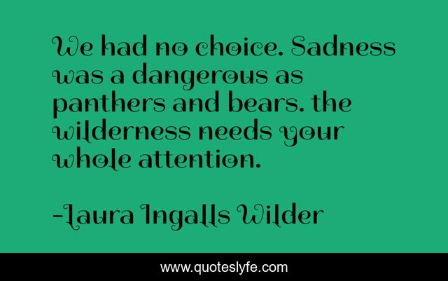 This page presents the quote "We had no choice. Sadness was a dangerous as panthers and bears. the wilderness needs your whole attention.". Author of this quote is Laura Ingalls Wilder. This quote is about emotion, sadness, prairie, homesteading, wilderness,.
