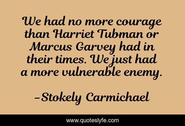 This page presents the quote "We had no more courage than Harriet Tubman or Marcus Garvey had in their times. We just had a more vulnerable enemy.". Author of this quote is Stokely Carmichael. This quote is about enemy, just,.