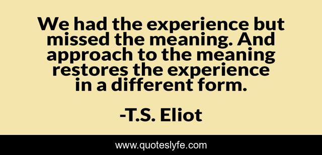 This page presents the quote "We had the experience but missed the meaning. And approach to the meaning restores the experience in a different form.". Author of this quote is T.S. Eliot. This quote is about enthusiasm, inspirational,.