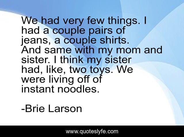 This page presents the quote "We had very few things. I had a couple pairs of jeans, a couple shirts. And same with my mom and sister. I think my sister had, like, two toys. We were living off of instant noodles.". Author of this quote is Brie Larson. This quote is about living, sister, think,.