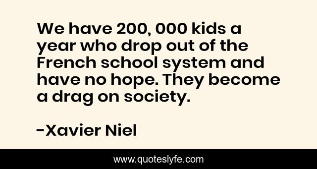 This page presents the quote "We have 200, 000 kids a year who drop out of the French school system and have no hope. They become a drag on society.". Author of this quote is Xavier Niel. This quote is about society, school, kids,.