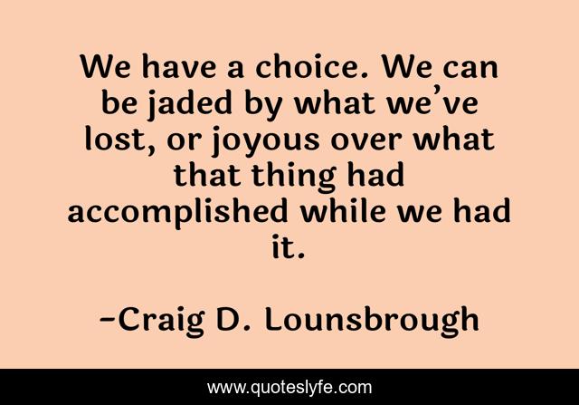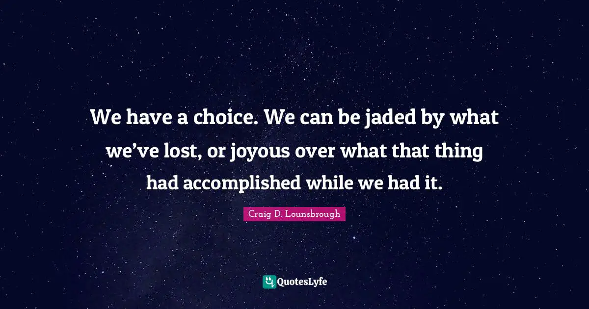 This page presents the quote "We have a choice. We can be jaded by what we’ve lost, or joyous over what that thing had accomplished while we had it.". Author of this quote is Craig D. Lounsbrough. This quote is about loss, jaded, joyous, achieved, joy, losses, choice, grief, accomplished,.
