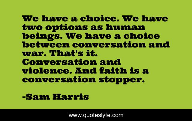 This page presents the quote "We have a choice. We have two options as human beings. We have a choice between conversation and war. That's it. Conversation and violence. And faith is a conversation stopper.". Author of this quote is Sam Harris. This quote is about faith, belief, spirituality, humanism, atheism, religion, agnosticism, ethics,.