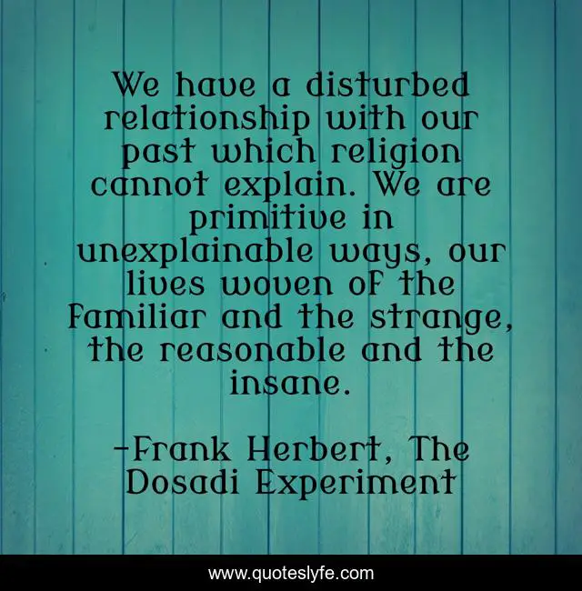 This page presents the quote "We have a disturbed relationship with our past which religion cannot explain. We are primitive in unexplainable ways, our lives woven of the familiar and the strange, the reasonable and the insane.". Author of this quote is Frank Herbert, The Dosadi Experiment. This quote is about religion, humanity, insanity,.