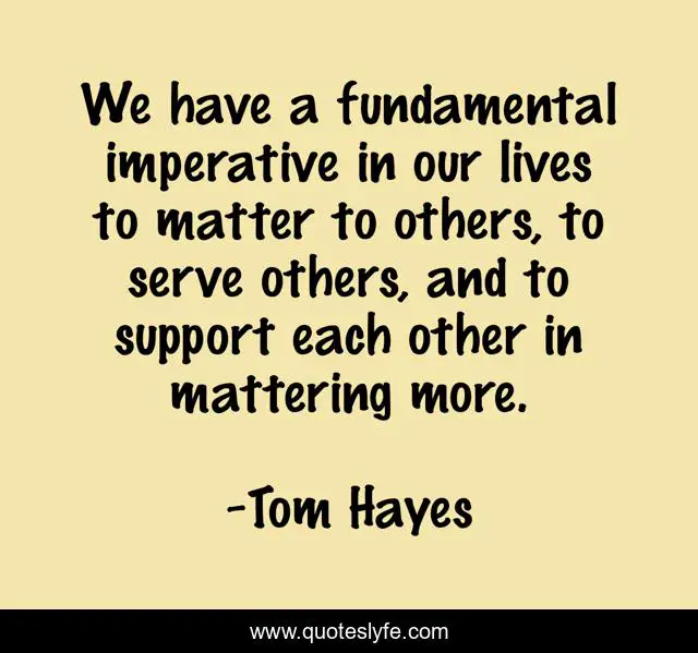 This page presents the quote "We have a fundamental imperative in our lives to matter to others, to serve others, and to support each other in mattering more.". Author of this quote is Tom Hayes. This quote is about imperative-for-life-serve, meaningful-life, relevant, service, matter-more, support, serve-others, matter, imperative,.