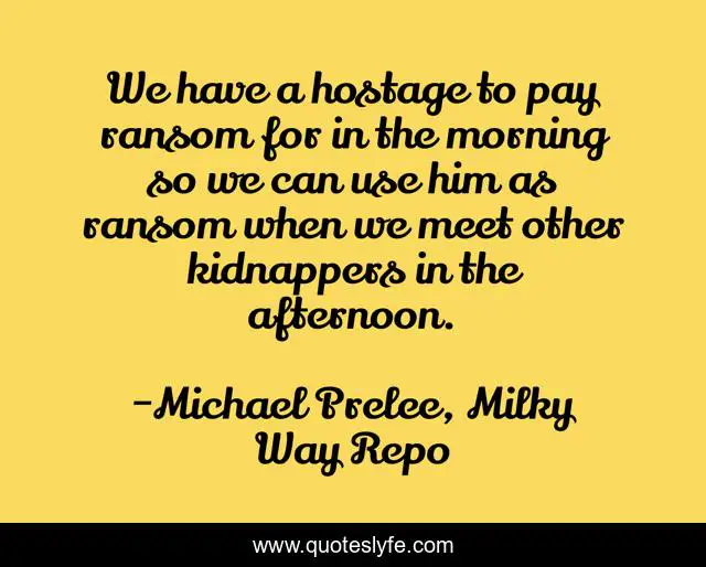 "Michael Prelee, Milky Way Repo Quotes." Quoteslyfe.com, 2025. Sat. 06 Dec. 2025. <https://www.quoteslyfe.com/quote/We-have-a-hostage-to-pay-ransom-193493>.