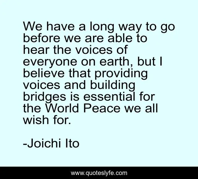 This page presents the quote "We have a long way to go before we are able to hear the voices of everyone on earth, but I believe that providing voices and building bridges is essential for the World Peace we all wish for.". Author of this quote is Joichi Ito. This quote is about building, world, believe,.