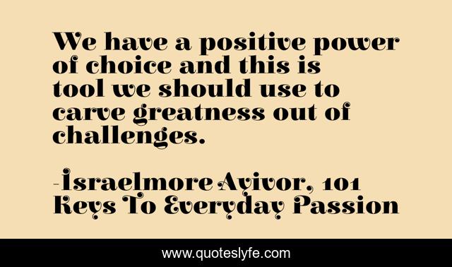 This page presents the quote "We have a positive power of choice and this is tool we should use to carve greatness out of challenges.". Author of this quote is Israelmore Ayivor, 101 Keys To Everyday Passion. This quote is about food-for-thought, make-a-choice, positive, challenge, confidence, choices, challenges, passion, choose,.
