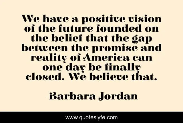 This page presents the quote "We have a positive vision of the future founded on the belief that the gap between the promise and reality of America can one day be finally closed. We believe that.". Author of this quote is Barbara Jordan. This quote is about future, day, vision,.