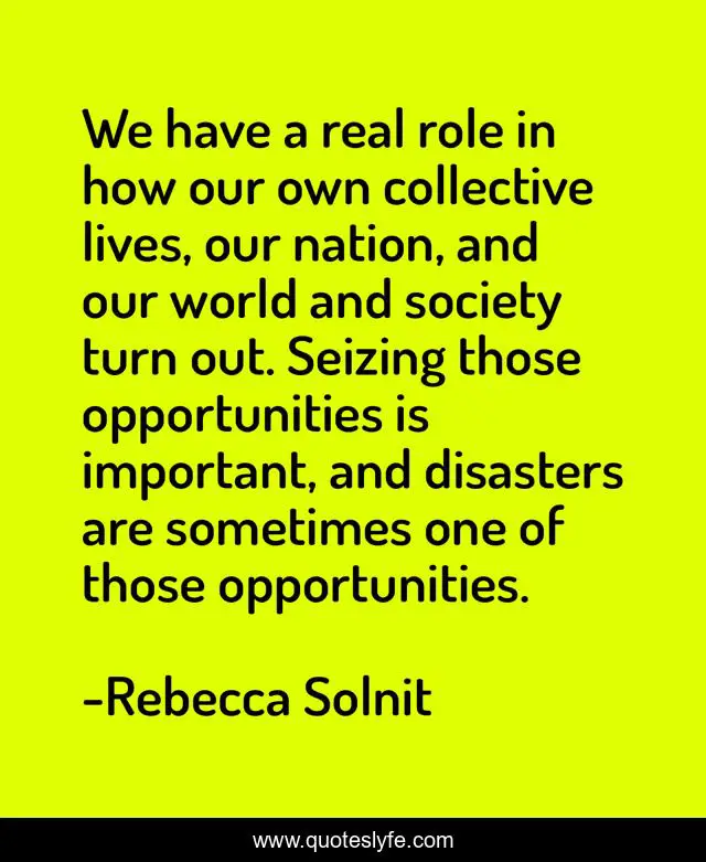 This page presents the quote "We have a real role in how our own collective lives, our nation, and our world and society turn out. Seizing those opportunities is important, and disasters are sometimes one of those opportunities.". Author of this quote is Rebecca Solnit. This quote is about world, opportunities, nation,.