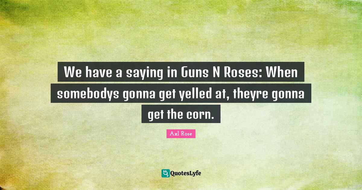 This page presents the quote "We have a saying in Guns N Roses: When somebodys gonna get yelled at, theyre gonna get the corn.". Author of this quote is Axl Rose. This quote is about corn, gun, rose,.