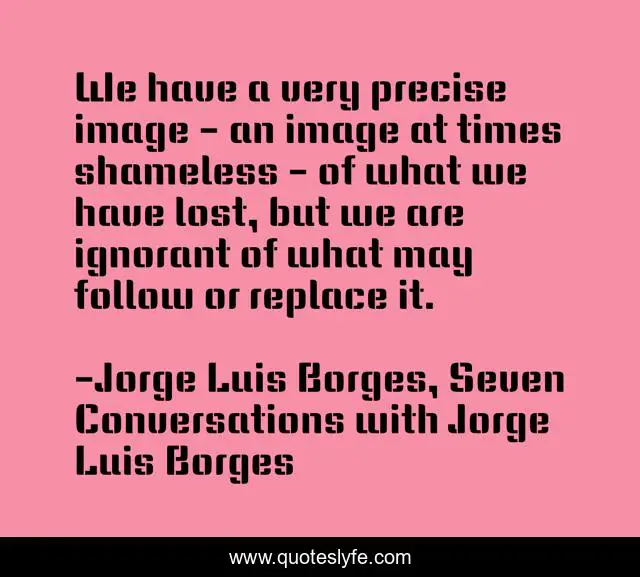This page presents the quote "We have a very precise image - an image at times shameless - of what we have lost, but we are ignorant of what may follow or replace it.". Author of this quote is Jorge Luis Borges, Seven Conversations with Jorge Luis Borges. This quote is about ignorance, change, memory,.