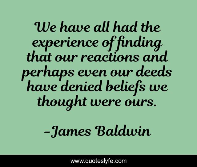 This page presents the quote "We have all had the experience of finding that our reactions and perhaps even our deeds have denied beliefs we thought were ours.". Author of this quote is James Baldwin. This quote is about thought, finding, beliefs,.
