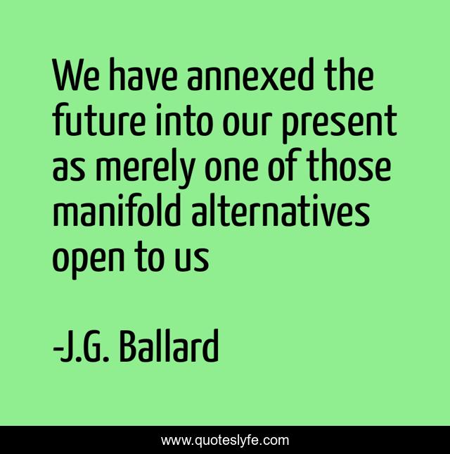 This page presents the quote "We have annexed the future into our present as merely one of those manifold alternatives open to us". Author of this quote is J.G. Ballard. .