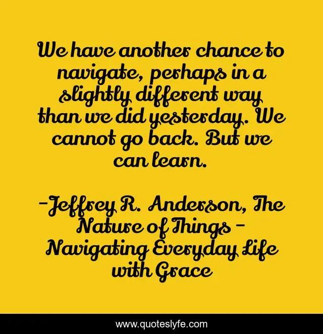 This page presents the quote "We have another chance to navigate, perhaps in a slightly different way than we did yesterday. We cannot go back. But we can learn.". Author of this quote is Jeffrey R. Anderson, The Nature of Things - Navigating Everyday Life with Grace. This quote is about navigation, grace, life-lessons,.