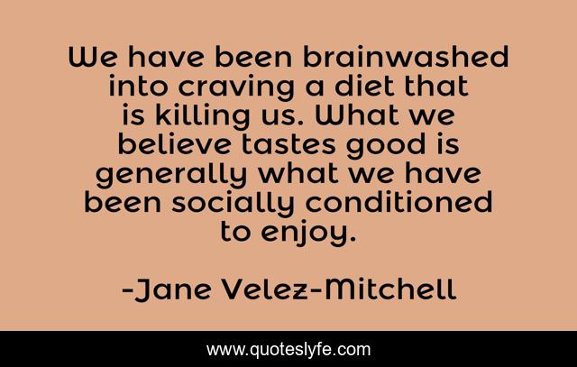 This page presents the quote "We have been brainwashed into craving a diet that is killing us. What we believe tastes good is generally what we have been socially conditioned to enjoy.". Author of this quote is Jane Velez-Mitchell. This quote is about enjoy, good, believe,.