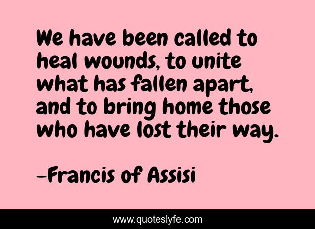 This page presents the quote "We have been called to heal wounds, to unite what has fallen apart, and to bring home those who have lost their way.". Author of this quote is Francis of Assisi. This quote is about confidence, positive, motivational, optimistic, inspirational, enthusiasm,.