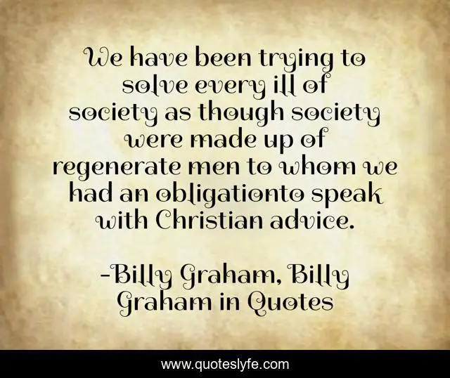 This page presents the quote "We have been trying to solve every ill of society as though society were made up of regenerate men to whom we had an obligationto speak with Christian advice.". Author of this quote is Billy Graham, Billy Graham in Quotes. This quote is about billy-graham, church,.
