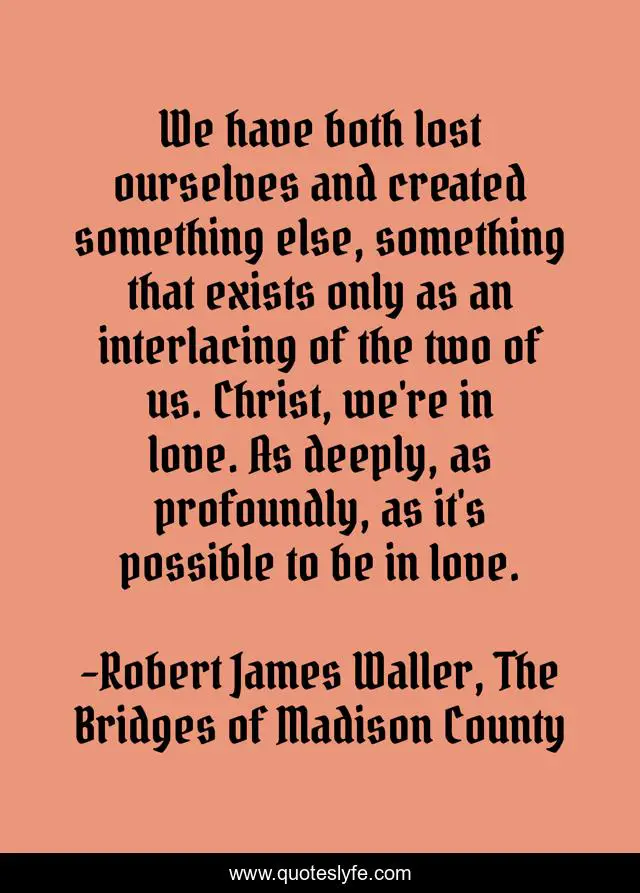 This page presents the quote "We have both lost ourselves and created something else, something that exists only as an interlacing of the two of us. Christ, we're in love. As deeply, as profoundly, as it's possible to be in love.". Author of this quote is Robert James Waller, The Bridges of Madison County. This quote is about love, affection,.