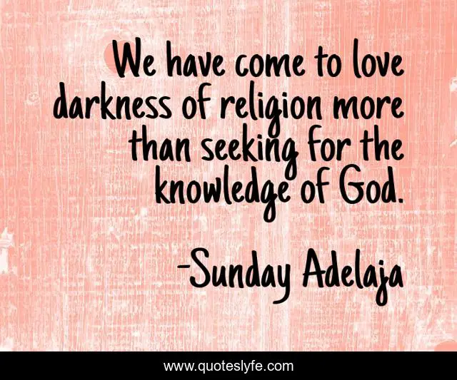 This page presents the quote "We have come to love darkness of religion more than seeking for the knowledge of God.". Author of this quote is Sunday Adelaja. This quote is about god, seek, darkness, knowledge, religion,.