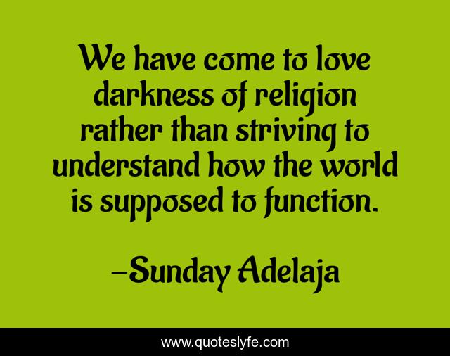 This page presents the quote "We have come to love darkness of religion rather than striving to understand how the world is supposed to function.". Author of this quote is Sunday Adelaja. This quote is about religion, strive, understand, world,.